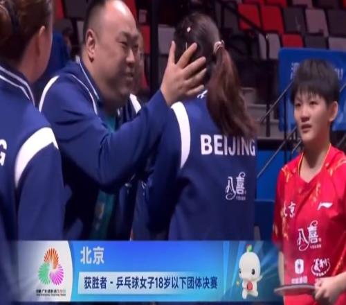 随着祝启慧在第四局以12比10击败姜依依,以3比1赢下第五场对决,北京U18女队以总比分3比2获胜,夺得了粤港澳全运会乒乓球项目的第一块金牌。祝启慧回到场边,这时候北京U18女队个个喜极而泣,北京队的主教练也非常兴奋,他揉揉了祝启慧的头。祝启慧一脸平静地看着还在激动落泪的姐姐们。没错,祝启慧是北京U18女乒年龄最小的队员,如今只有13岁,但跳级参赛的她是北京U18女队的头号选手。在这场击败山东U18女乒的比赛中,祝启慧一人独取2分,分别击败了国青队的丁怡婕和姜依依。