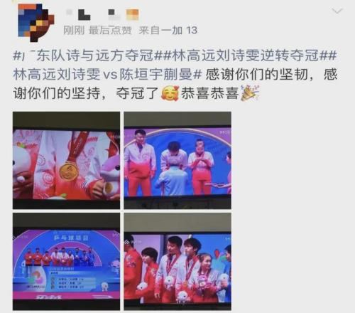 在14日晚结束的混双决赛中,广东队组合林高远/刘诗雯以4:2(局分:13-15、8-11、11-8、11-8、11-8、12-10)战胜江苏队组合陈垣宇/蒯曼,夺得冠军!